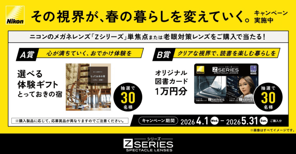 メガネのオーサカでは現在、**ニコン メガネレンズ「Zシリーズ」**のご購入者様を対象にした、豪華プレゼントキャンペーンを実施中です。