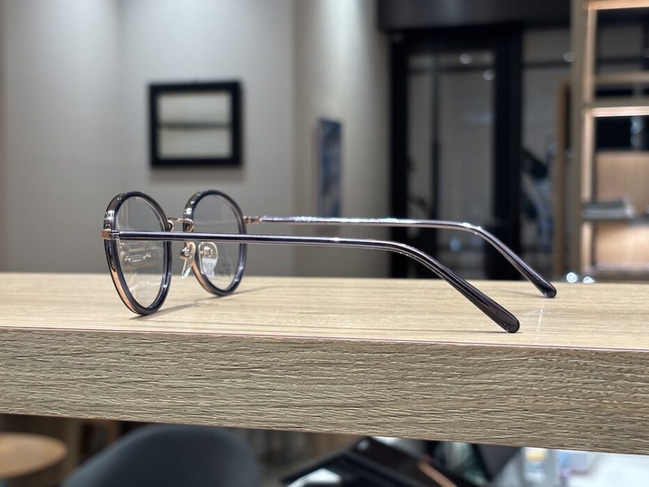 プラスチックパーツを半透明にすることにより、あえてメタルフレームの色がうっすら見え、とても複層的なデザインに見えるメガネです。